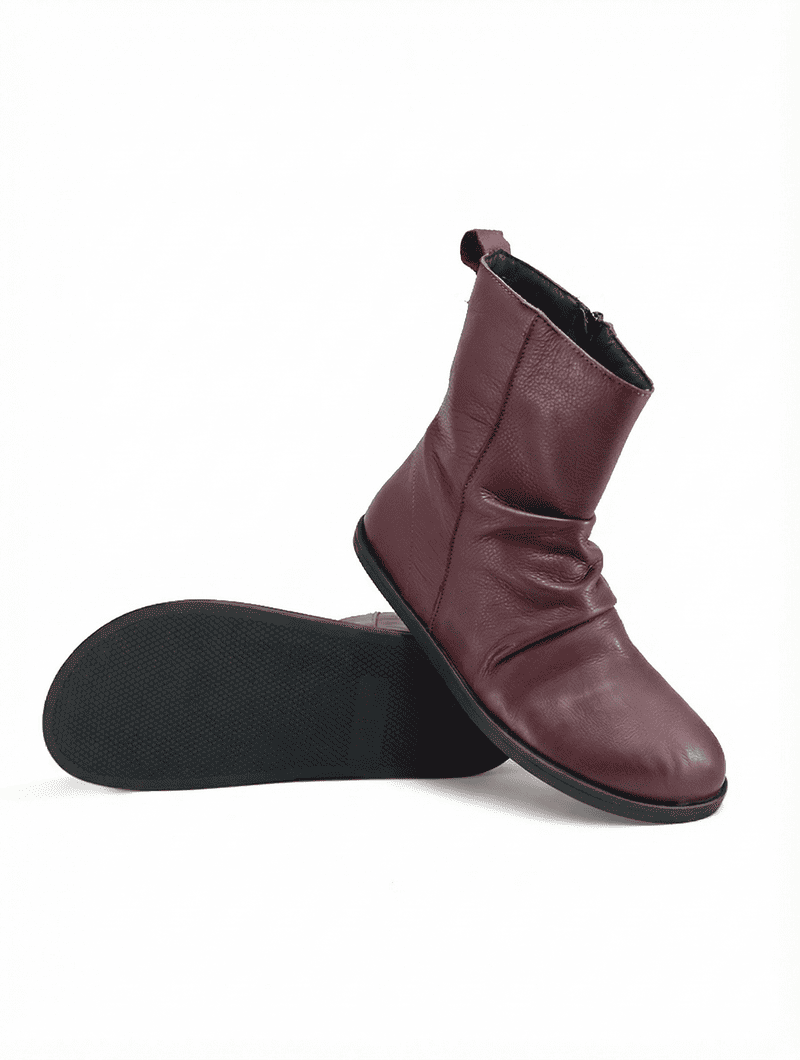Estos botines barefoot con cremallera color burdeos están fabricados con piel napa de primera calidad.