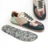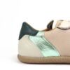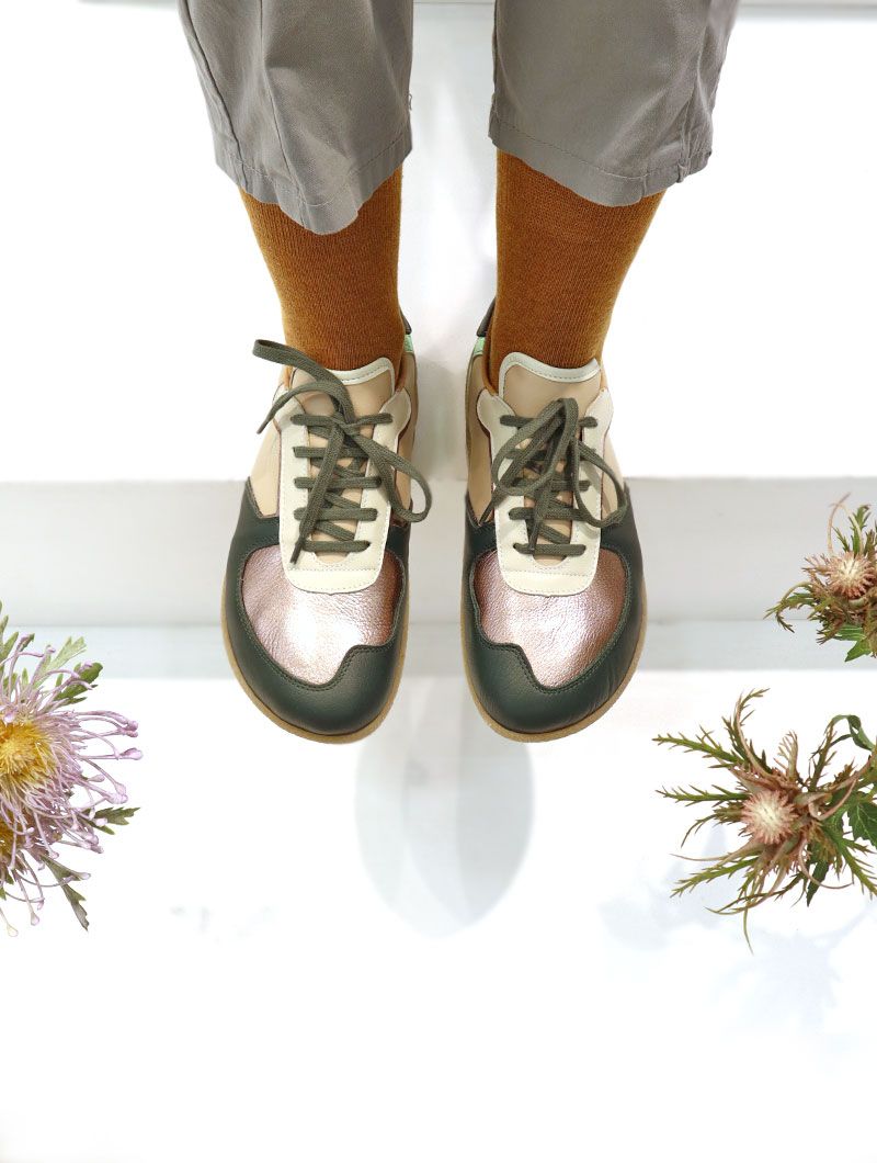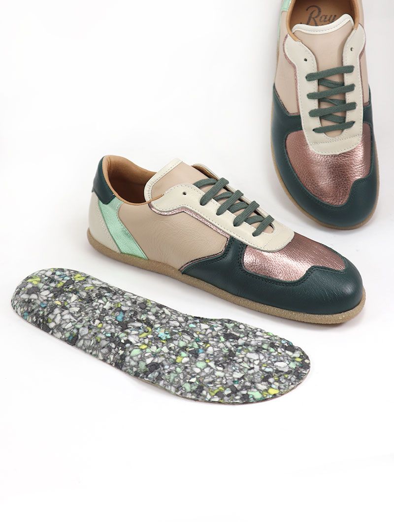 El calzado respetuoso, como estas zapatillas barefoot mujer verde y rosa metalizado, es el más parecido a caminar descalzo cuya horma se asemeja lo máximo posible a la forma del pie.