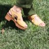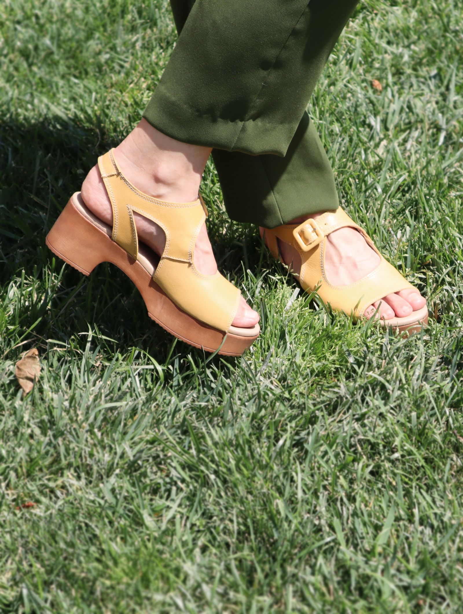 Cómodas sandalias de piel de curtición ecológica en color mostaza apagado, con plantilla antifatiga, ajuste con hebilla en empeine y suela ligera de 5,5cm en talón y 3cm en metatarso efecto madera.