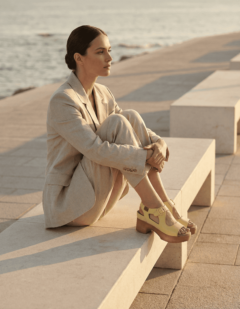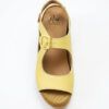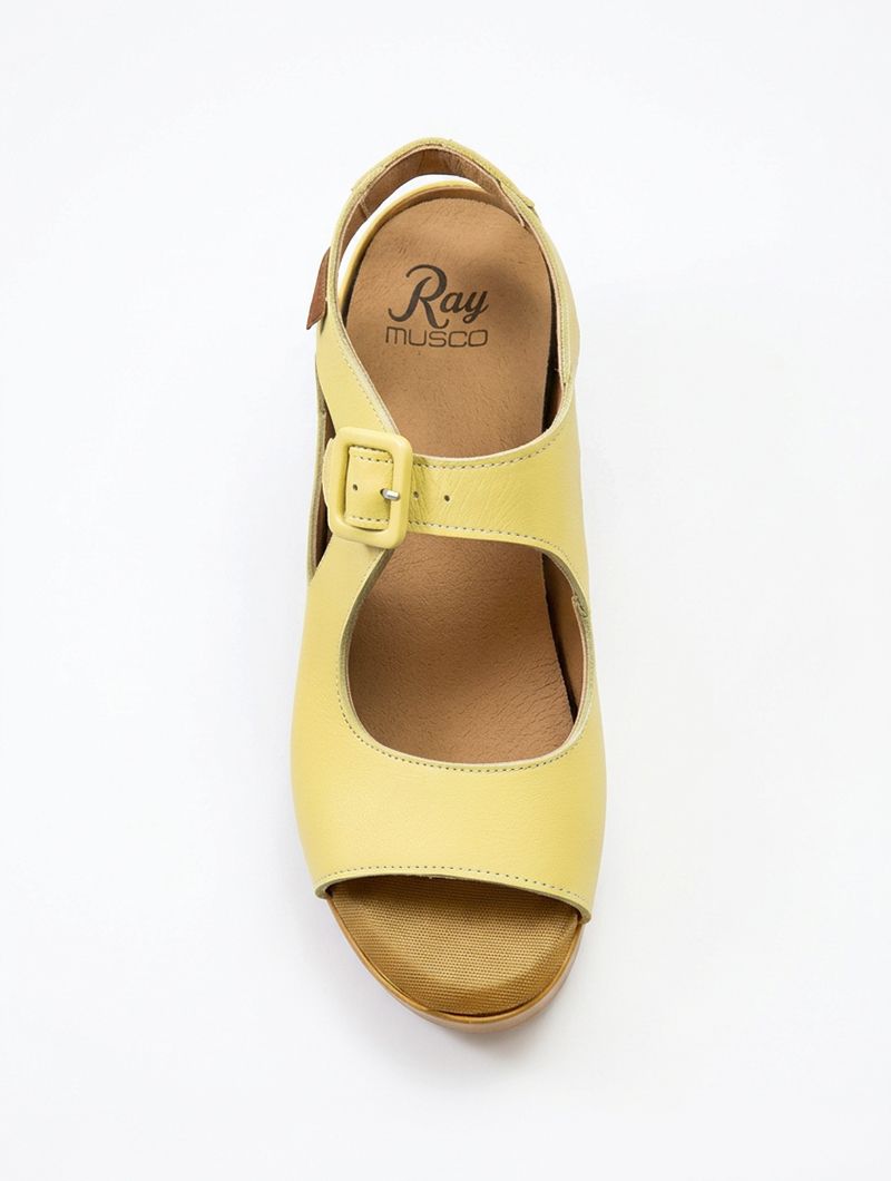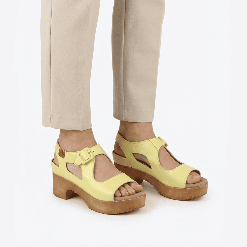Estas cómodas sandalias para plantillas cruzadas en color amarillo vainilla con plataforma acabado madera te ofrecen una mezcla de estilos perfecta para cualquier ocasión.