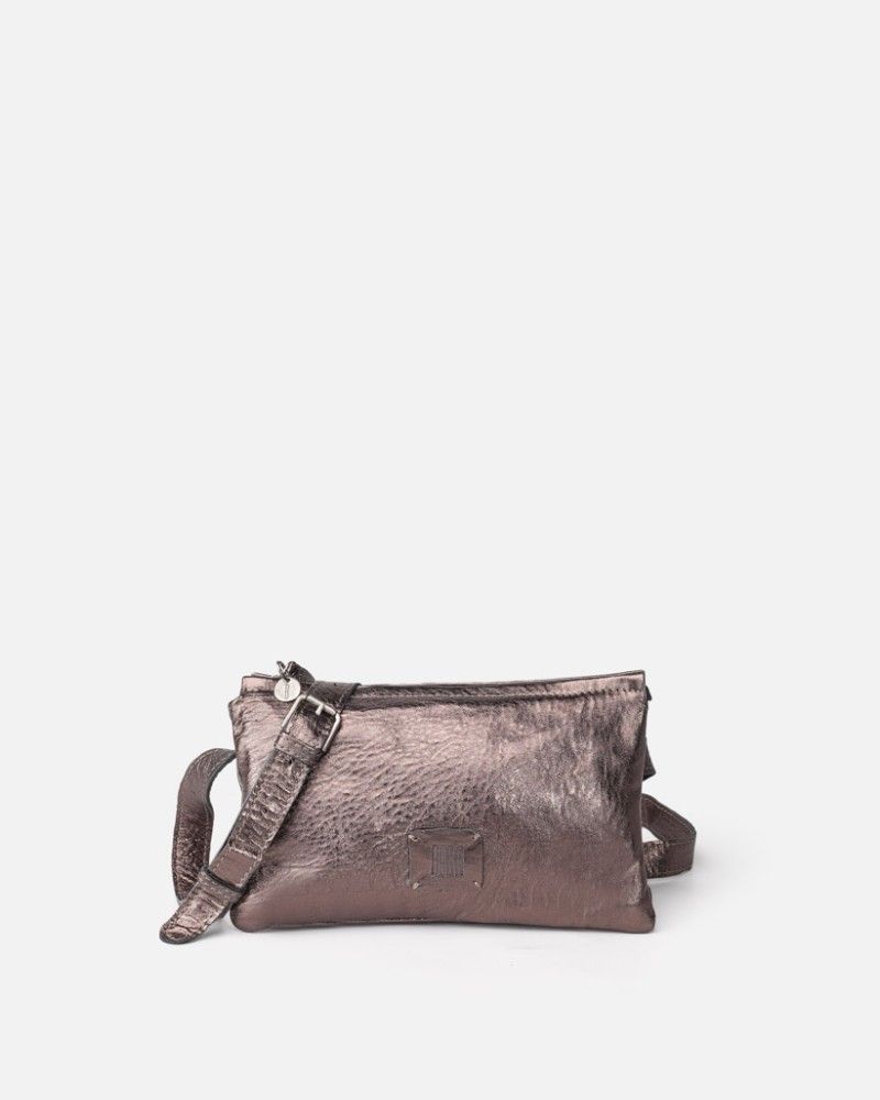 Bolso bandolera de piel ovina metalizada. Formato rectangular, bandolera ajustable, solapa con boton, y cierre con cremallera. Bolsillos internos, y forro de algodón.